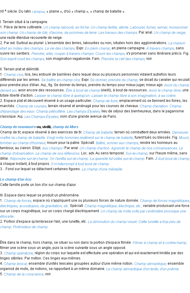 Définition de l’équipe de la-definition.fr (édition de 2009) pour le mot « champ ».Merci à Fabienne et Emmanuelle pour la numérisation du mot champ.