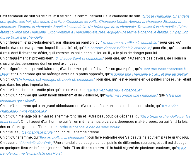 Ancienne signification issue du dico de l’Académie Française, parue en 1798.Merci à Blaise et Danièle pour la numérisation du mot chandelle.