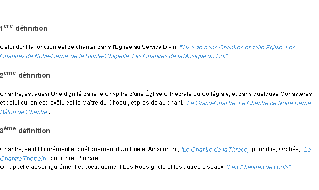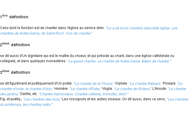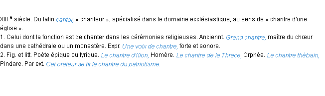 Ancienne signification développée en 1798 par l’académie Française (ACAD - 1798).Merci à Jérôme et Claudette pour la numérisation du mot chantre.