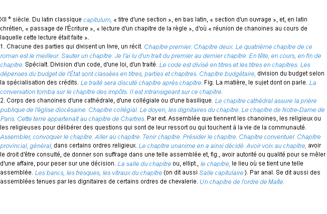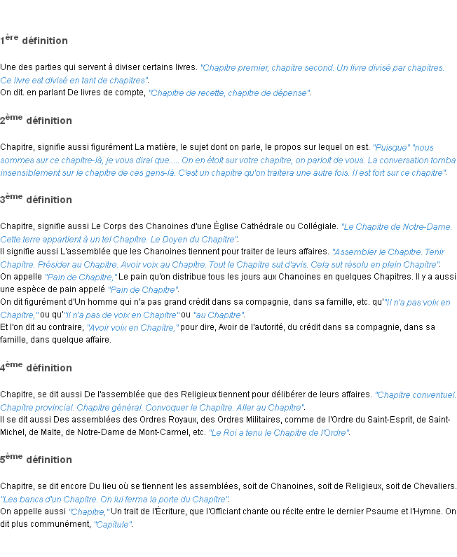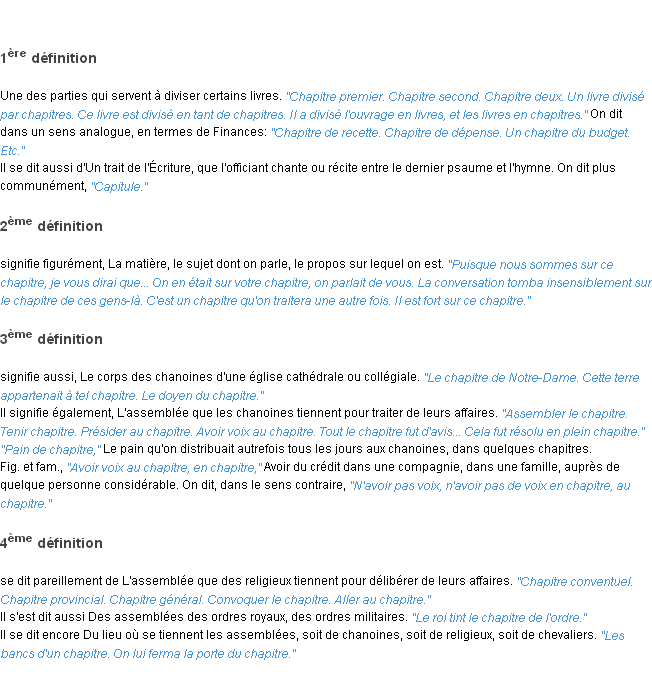 Ancienne définition académique pour le terme « chapitre » (parue en 1835).