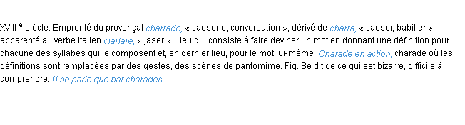 Ancienne définition développée dans dictionnaire académique, 1798.Merci à Juliette et Armel pour la numérisation du mot charade.