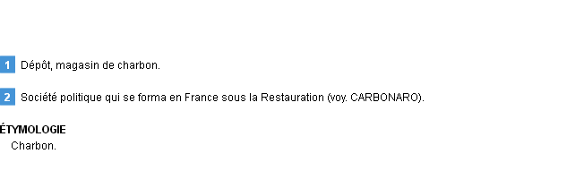 Définition du mot « charbonnerie » par Emile Littré (édition de 1876).Merci à Stéphane et Pierre pour la numérisation du mot charbonnerie.