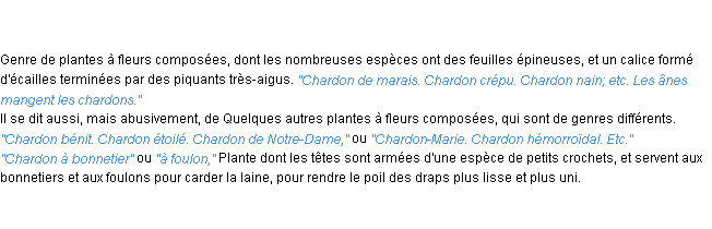 Ancienne signification développée en 1798 par l’académie Française (ACAD - 1798).Merci à Paulette et Germain pour la numérisation du mot chardon.