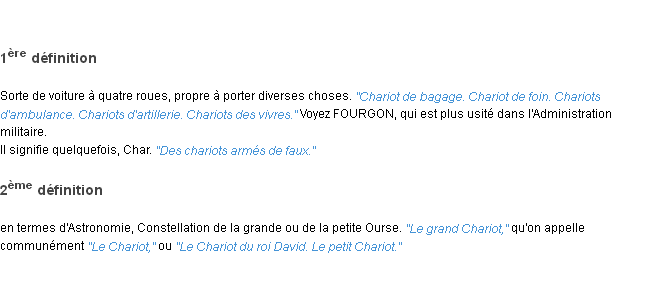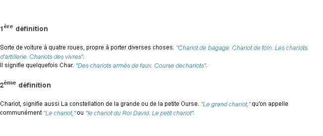 Ancienne signification issue du dico de l’Académie Française, parue en 1798.Merci à Sylvestre et Hélène pour la numérisation du mot chariot.