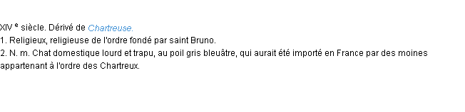 Signification éditée en 2008 pour le terme « chartreux » par l’équipe de wiktionary France.Merci à Alain et Doriane pour la numérisation du mot chartreux.