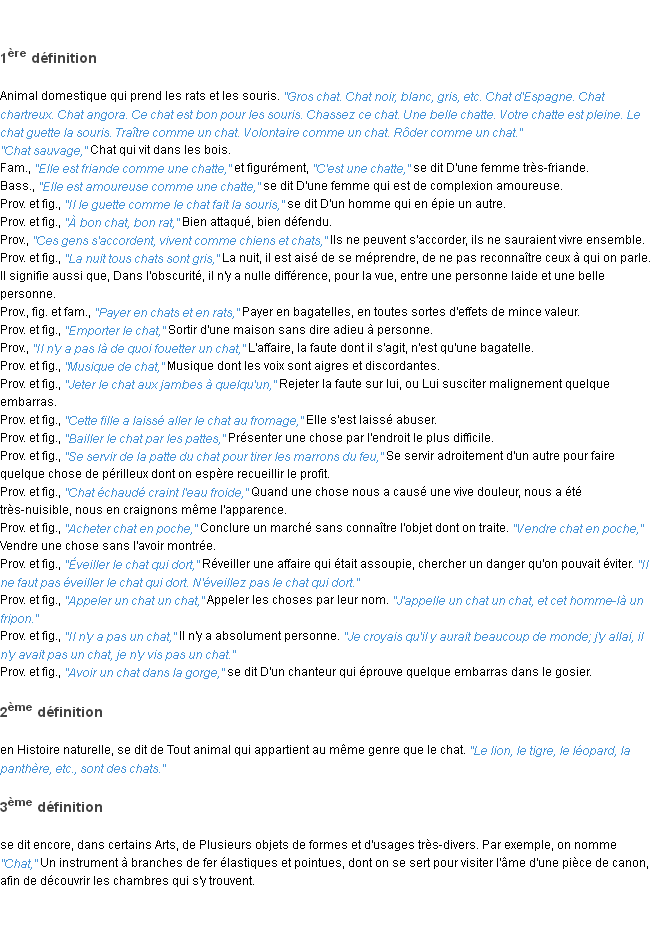 Ancienne définition « chat » du dictionnaire académique Français, parution de l’année 1798.Merci à Patrice et Laure pour la numérisation du mot chat.