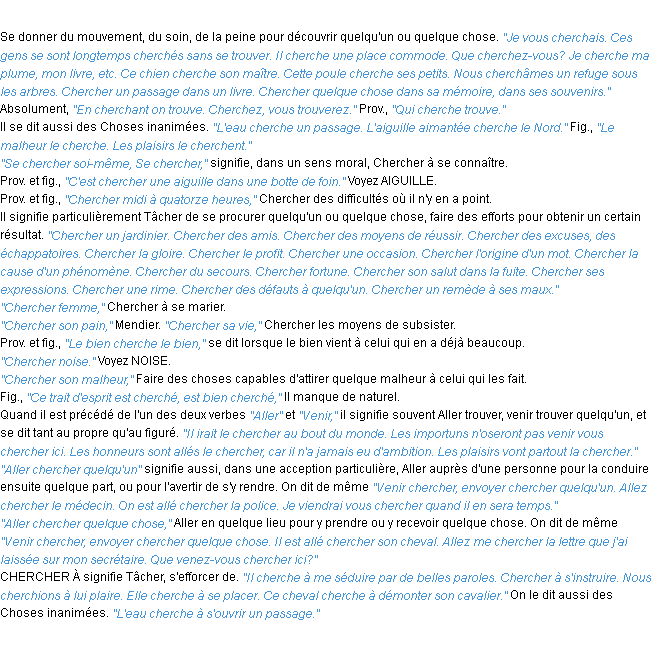 Ancienne signification du terme « chercher », parution de 1798, dictionnaire académique Français.Merci à Rémy et Berthe pour la numérisation du mot chercher.