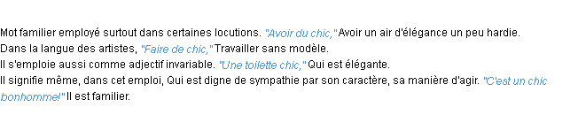 Signification éditée en 2008 pour le terme « chic » par l’équipe de wiktionary France.Merci à Luc et Sacha pour la numérisation du mot chic.