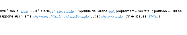 Signification éditée en 2008 pour le terme « chiite » par l’équipe de wiktionary France.Merci à Lucie et Henri pour la numérisation du mot chiite.