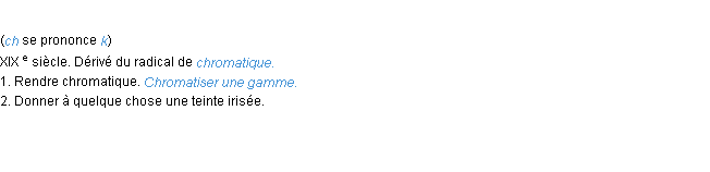 Définition de l’Académie Française (édition de 1932) pour le mot « chromatiser ».Merci à Mathilde et Flavie pour la numérisation du mot chromatiser.