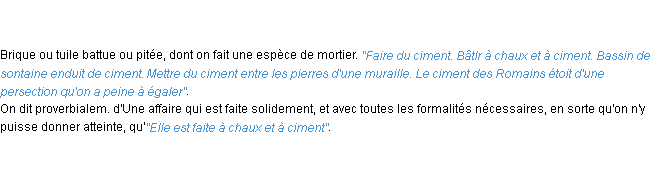 Ancienne signification parue en 1798 dans dictionnaire de l’Académie Française.Merci à Maximilienne et Basile pour la numérisation du mot ciment.