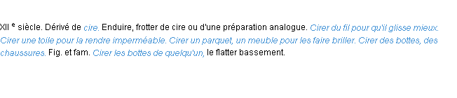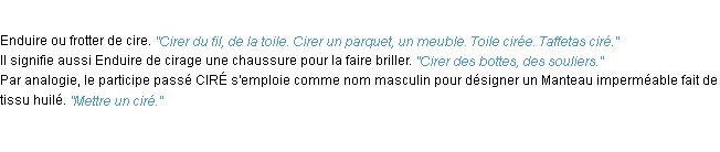Ancienne signification parue en 1798 dans dictionnaire de l’Académie Française.Merci à Josiane et Clément pour la numérisation du mot cirer.