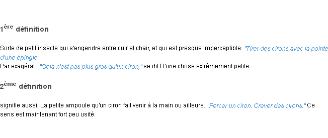 Ancienne signification développée en 1798 par l’académie Française (ACAD - 1798).Merci à Chloé et Jeannot pour la numérisation du mot ciron.