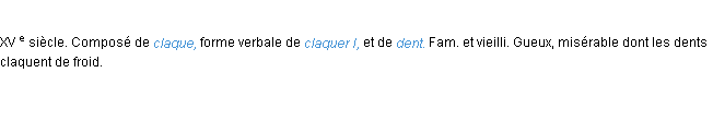 Ancienne signification issue du dico de l’Académie Française, parue en 1798.Merci à Lionel et Nadine pour la numérisation du mot claquedent.