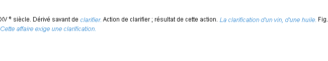 Signification développée en 1876 par Mr Littré (dictionnaire dit d’Emile Littré).Merci à Fifi et Armelle pour la numérisation du mot clarification.
