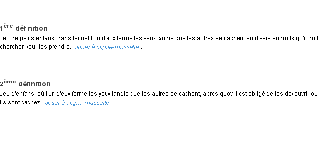 Ancienne définition du mot « cligne-mussette » par l’Académie Française (édition de 1694).Merci à Faustine et Fernande pour la numérisation du mot cligne-mussette.
