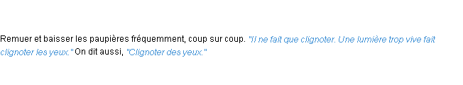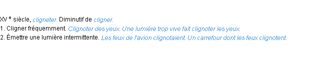 Ancienne signification développée en 1798 par l’académie Française (ACAD - 1798).Merci à Joséphine et Désirée pour la numérisation du mot clignoter.