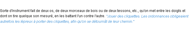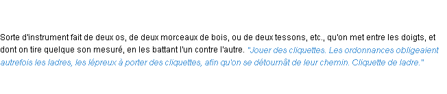 Signification du terme « cliquette », parution de 1876 (dictionnaire le Littré).- Autres Recherches