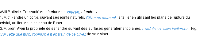 Ancienne définition de l’Académie Française (édition de 1798) pour le mot « cliver ».Merci à Laurette et Jolie pour la numérisation du mot cliver.
