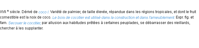 Définition du mot « cocotier » par l’équipe de la-definition.fr (édition de 2011).Merci à Sidonie et Sandrine pour la numérisation du mot cocotier.