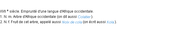 Signification parue en 2009 (source la-definition.fr).Merci à Geneviève et Jérôme pour la numérisation du mot cola.