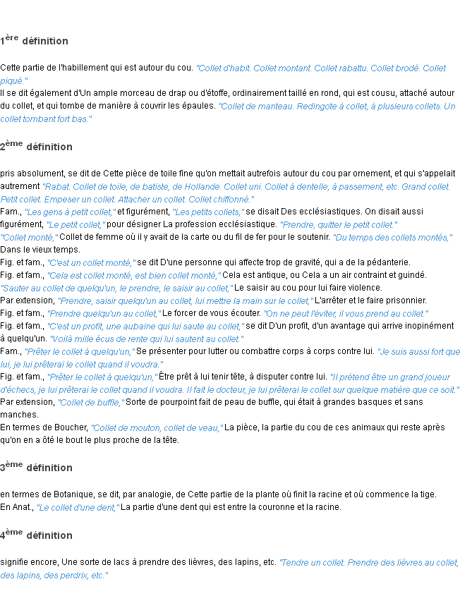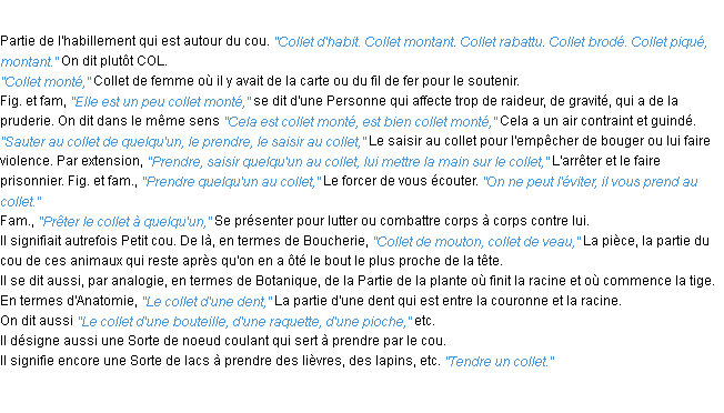 Définition du mot « collet » par l’Académie Française (édition de 1932).