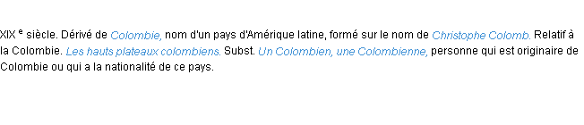 Définition issue du dictionnaire wiktionary pour le mot « colombien ».Merci à Pascale et Léa pour la numérisation du mot colombien.