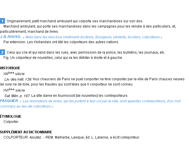 Définition d’Emile Littré (édition de 1876) pour le mot « colporteur ».Merci à Colombain et Pierre pour la numérisation du mot colporteur.