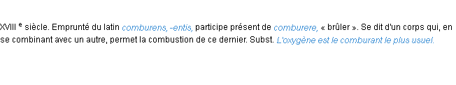 Signification développée en 1876 par Mr Littré (dictionnaire dit d’Emile Littré).Merci à Bernadette et Joséphine pour la numérisation du mot comburant.