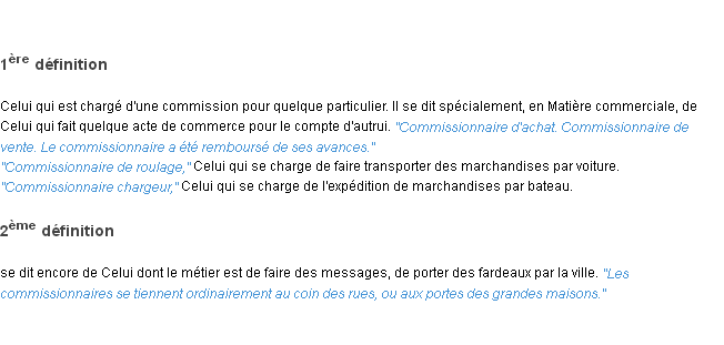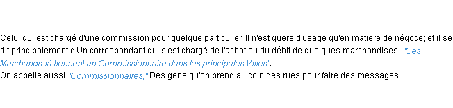 Ancienne signification parue en 1798 dans dictionnaire de l’Académie Française.Merci à Arnaud et Pierre pour la numérisation du mot commissionnaire.