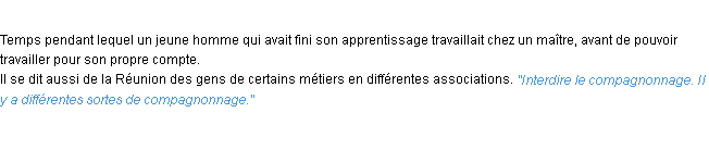Signification éditée en 2010 par l’équipe de la-definition.fr.Merci à Josée et Michèle pour la numérisation du mot compagnonnage.