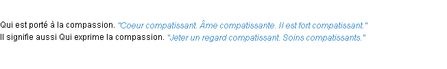 Définition de l’équipe de la-definition.fr (édition de 2009) pour le mot « compatissant ».Merci à Andrée et Yves pour la numérisation du mot compatissant.