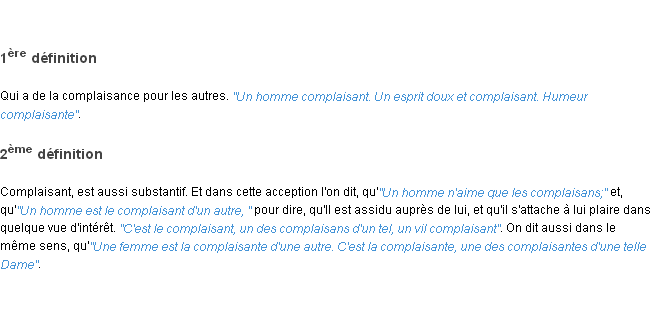 Définition du mot « complaisant » par l’équipe de la-definition.fr (édition de 2011).Merci à Sylviane et éliane pour la numérisation du mot complaisant.