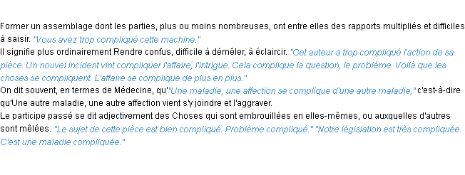 Définition de « compliquer » de source académique (Académie Française, parution de 1932).