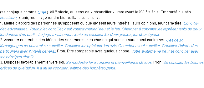 Définition de « concilier » de source académique (Académie Française, parution de 1986).