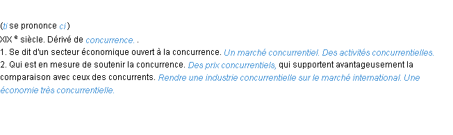 Signification éditée en 2008 pour le terme « concurrentiel » par l’équipe de wiktionary France.Merci à Jérémie et Hortense pour la numérisation du mot concurrentiel.