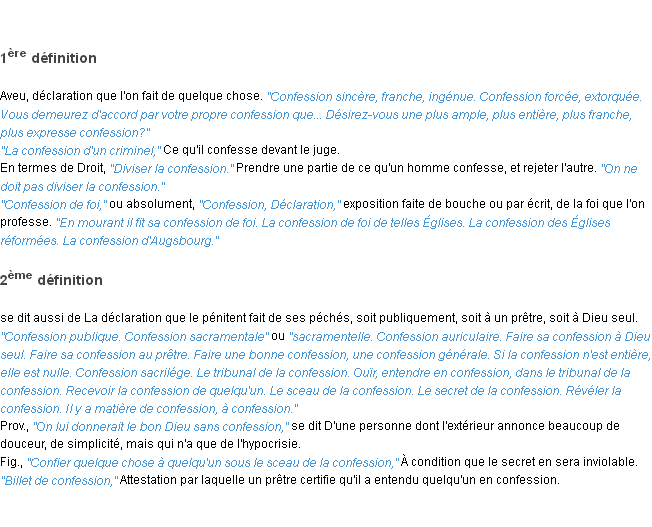 Ancienne définition de l’Académie Française (édition de 1835) pour le mot « confession ».