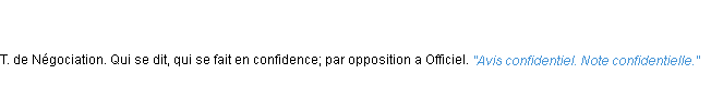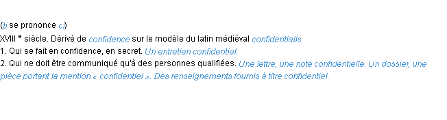 Ancienne définition de l’Académie Française (édition de 1798) pour le mot « confidentiel ».Merci à éloise et Delphine pour la numérisation du mot confidentiel.