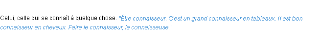 Définition issue du dictionnaire wiktionary pour le mot « connaisseur ».Merci à Laurent et Sylviane pour la numérisation du mot connaisseur.