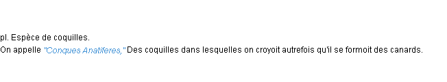 Ancienne définition de l’Académie Française (édition de 17962) pour le mot « conques anatiferes ».Merci à Rémi et Madeline pour la numérisation du mot conques anatiferes.