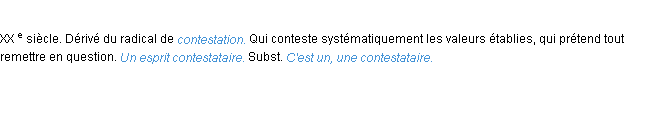 Signification éditée en 2008 pour le terme « contestataire » par l’équipe de wiktionary France.Merci à Amaury et Aude pour la numérisation du mot contestataire.