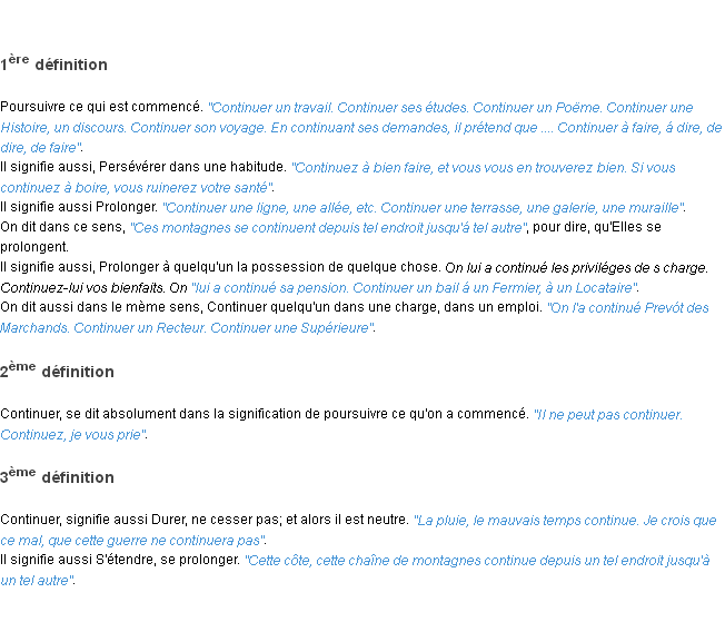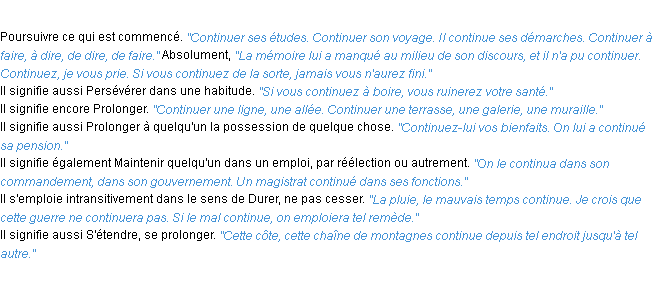 Définition de l’Académie Française (édition de 1986) pour le mot « continuer ».