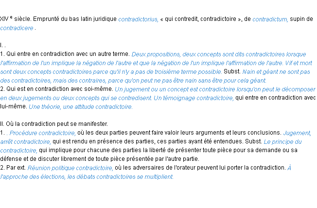 Ancienne définition académique pour le terme « contradictoire » (parue en 1835).
