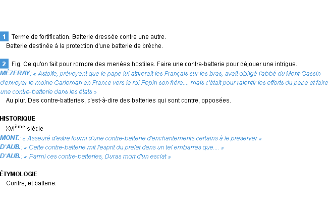 Ancienne signification du terme « contre-batterie », parution de 1798, dictionnaire académique Français.