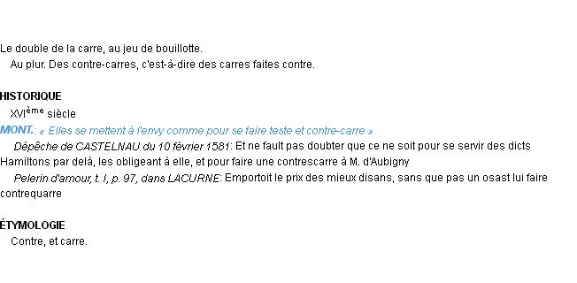 Signification développée en 1876 par Mr Littré (dictionnaire dit d’Emile Littré).Merci à Iréné et Placide pour la numérisation du mot contre-carre.