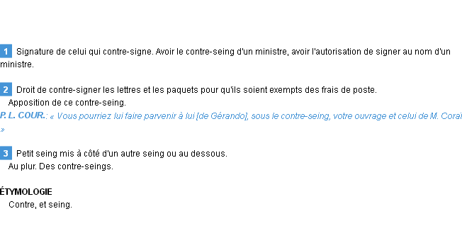 Signification éditée en 1876 pour le terme « contre-seing » par Emile Littré.