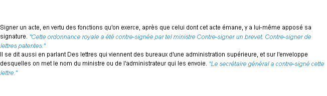 Ancienne définition de l’Académie Française (édition de 1835) pour le mot « contre-signer ».