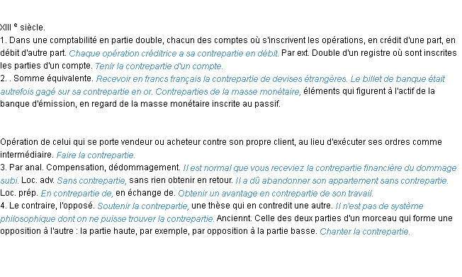 Signification du terme « contrepartie », parution de 1932, dictionnaire académique Français.