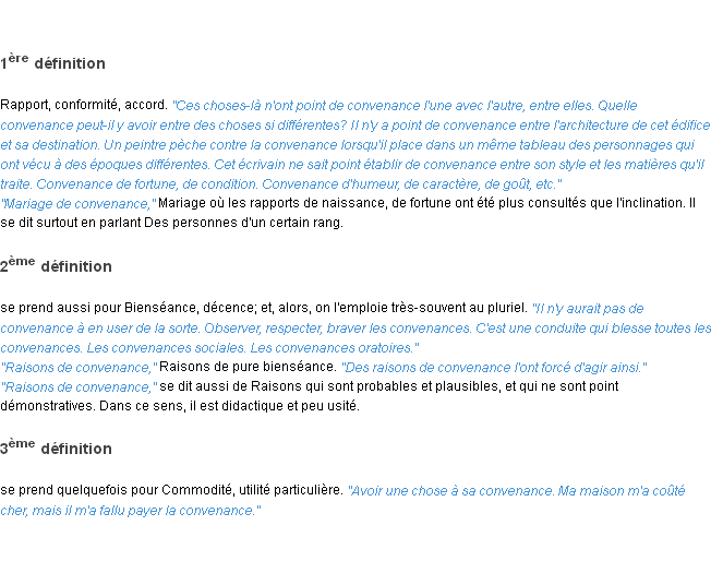 Ancienne signification développée en 1798 par l’académie Française (ACAD - 1798).Merci à Antoine et Jean-marie pour la numérisation du mot convenance.