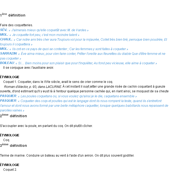 Signification éditée en 1876 pour le terme « coqueter » par Emile Littré.- Autres Recherches